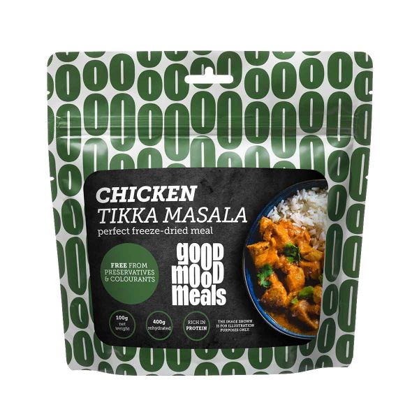 Kyckling tikka masala från Good Mood Meals är framtagen för att ge dig en varm och näringsrik måltid under utomhusaktiviteter. Detta frystorkade recept kombinerar kyckling med dehydrerad tikka masala-sås och utgör en komplett rätt anpassad för vandrare, trekkers och friluftsentusiaster. Måltiden är förpackad i en påse som möjliggör direkt tillagning i förpackningen.