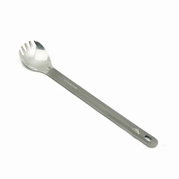 Tillverkad i livsmedelsgodkänt titan, kombinerar den lätthet, robusthet och korrosionsbeständighet. Den väger bara 19 g, vilket gör den till ett ultralätt tillbehör, perfekt för äventyrare som vill minska vikten på sin utrustning. Med en längd på 21,6 cm gör den det enkelt att nå botten av frystorkade måltidspåsar utan att smutsa ner händerna.