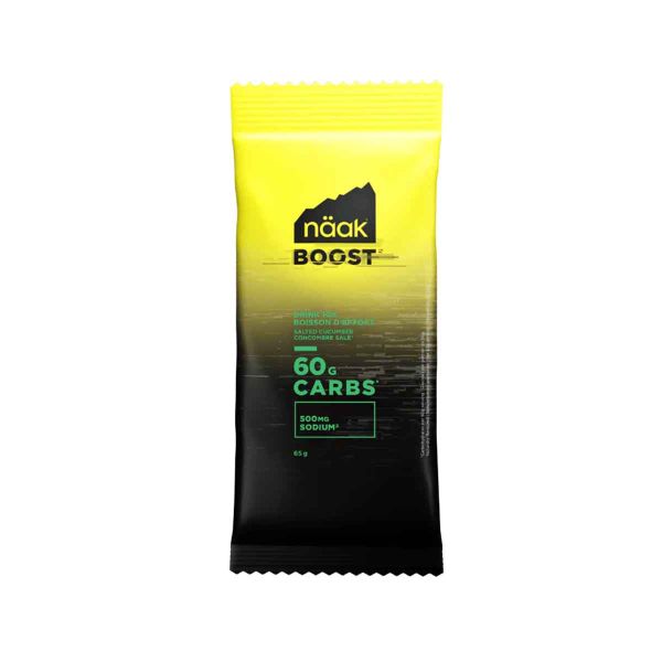 Näak Boost Energy energidryck med saltad gurka i stick à 65 g, idealisk för intensiva ansträngningar, med 60 g kolhydrater och ett glukos/fruktos-förhållande 2:1 för progressiv och effektiv energi. Praktiskt format att ta med, med 500 mg natrium för att kompensera förluster och en uppfriskande salt smak som minskar tröttheten.
